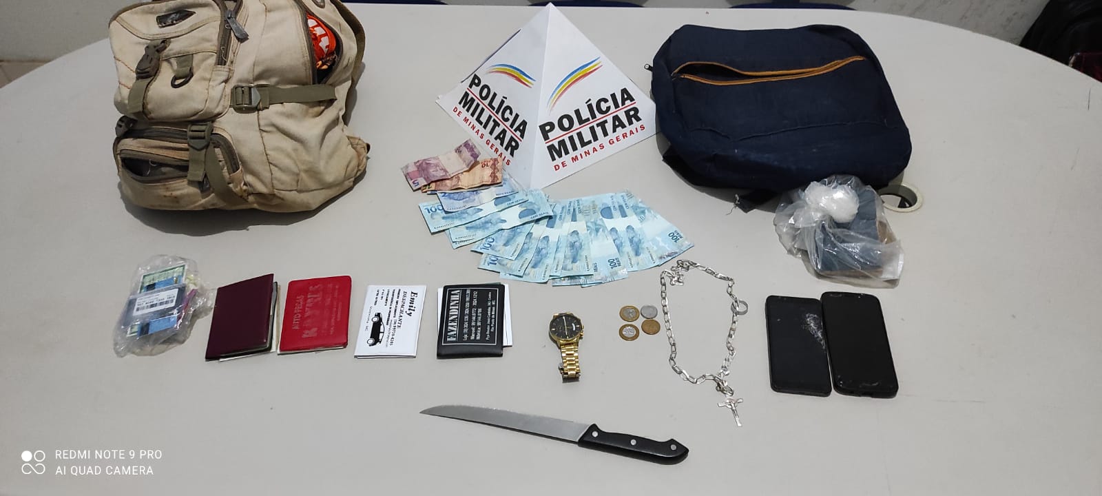 Durante as buscas os militares depararam com um dos envolvidos de 17 anos em uma estrada vicinal, próximo ao local do roubo. Foi localizado com ele a quantia de R$ 700,00 e outros bens das vítimas.