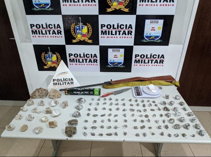 Segundo a Polícia Militar, eles receberam denúncias anônimas de que traficantes estariam escondendo drogas em um terreno baldio na Rua Tupis. Foram feitas buscas no local e os militares encontraram uma espingarda de pressão modificada; uma pedra bruta e uma porção de cocaína; cinco tabletes, 18 porções e 80 buchas de maconha; 17 pedras de tamanhos variados de crack e uma balança.