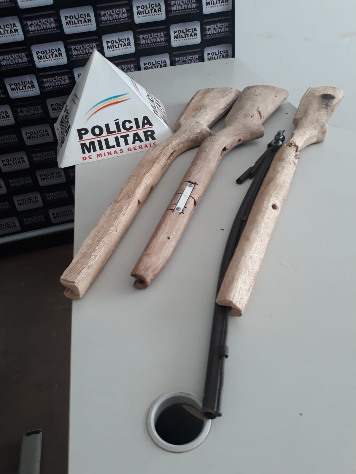 A arma de fogo, uma espingarda polveira, e duas coronhas de madeira foram apreendidas e entregues à Delegacia.