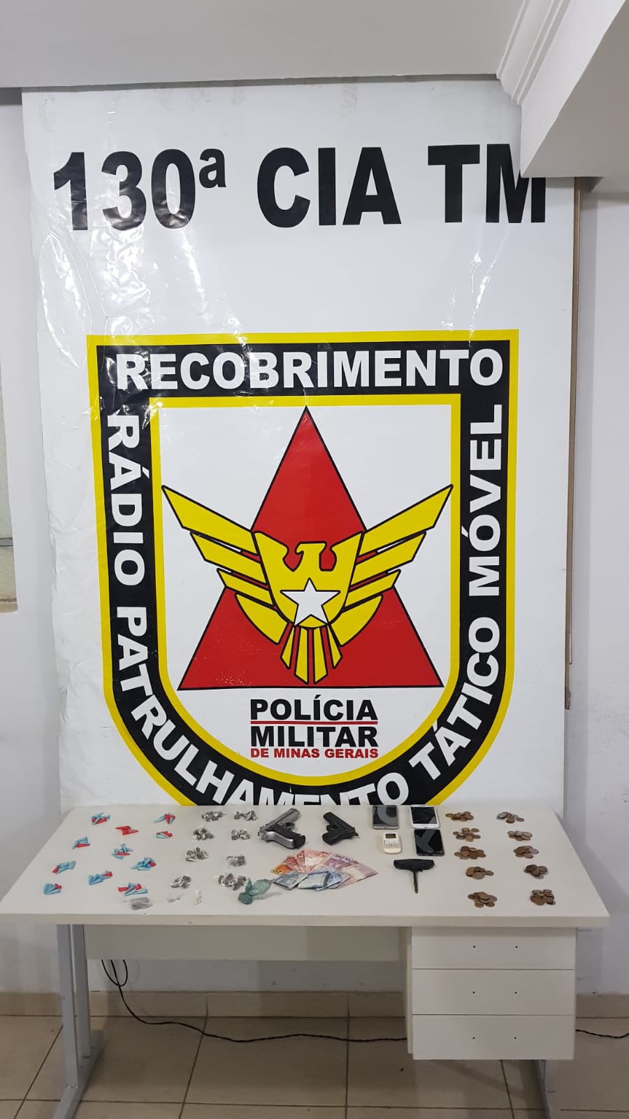 No local, a dupla foi abordada e durante as buscas foram encontradas nos telhados e em meio plantas do local sete pedras de crack, 34 buchas de maconha, duas porções da mesma droga, 64 pinos de cocaína, duas réplicas de arma de fogo, quatro celulares, saquinhos usados para embalar a droga, uma chave mixa e a quantia de R$ 154,00 reais.