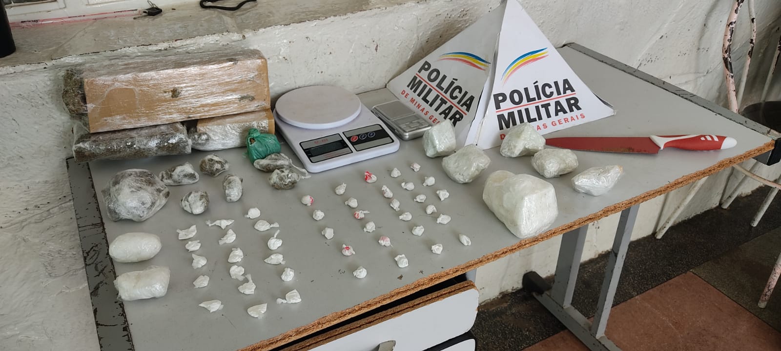 Diante das informações deslocaram até o local onde foi encontrado três barras grandes de maconha, oito porções grandes de maconha, duas porções de cocaína, 43 papelotes e seis pedras brutas da mesma droga, além de uma faca e balanças.