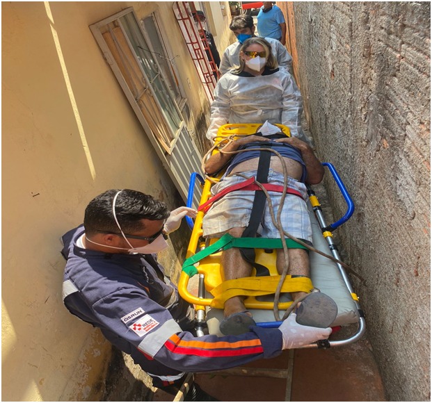 De acordo com os Militares, homem se queixava de fortes dores na região das costelas com dificuldades para se movimentar devido à queda, ainda durante atendimentos foi constato que a vítima apresentava sintomas gripais, por tanto durante as manobras de resgate,  a equipe realizou a paramentação conforme protocolos de atendimento a emergências com suspeita de COVID-19.