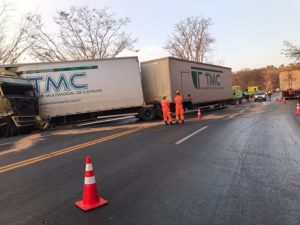 Corpo de bombeiros atendem ocorrência de colisão entre quatro carretas e um automóvel na BR 135