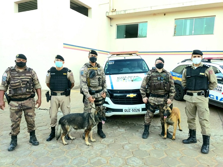 Com auxílio dos cães farejadores Raja e Drax no local, foram encontardos dez tabletes médios de maconha, seis tabletes pequenos e cinco buchas da mesma droga, além de uma porção de cocaína, uma balança de precisão, dois celulares, R$602,00 em dinheiro e diversos materiais para dolagem de entorpecentes.