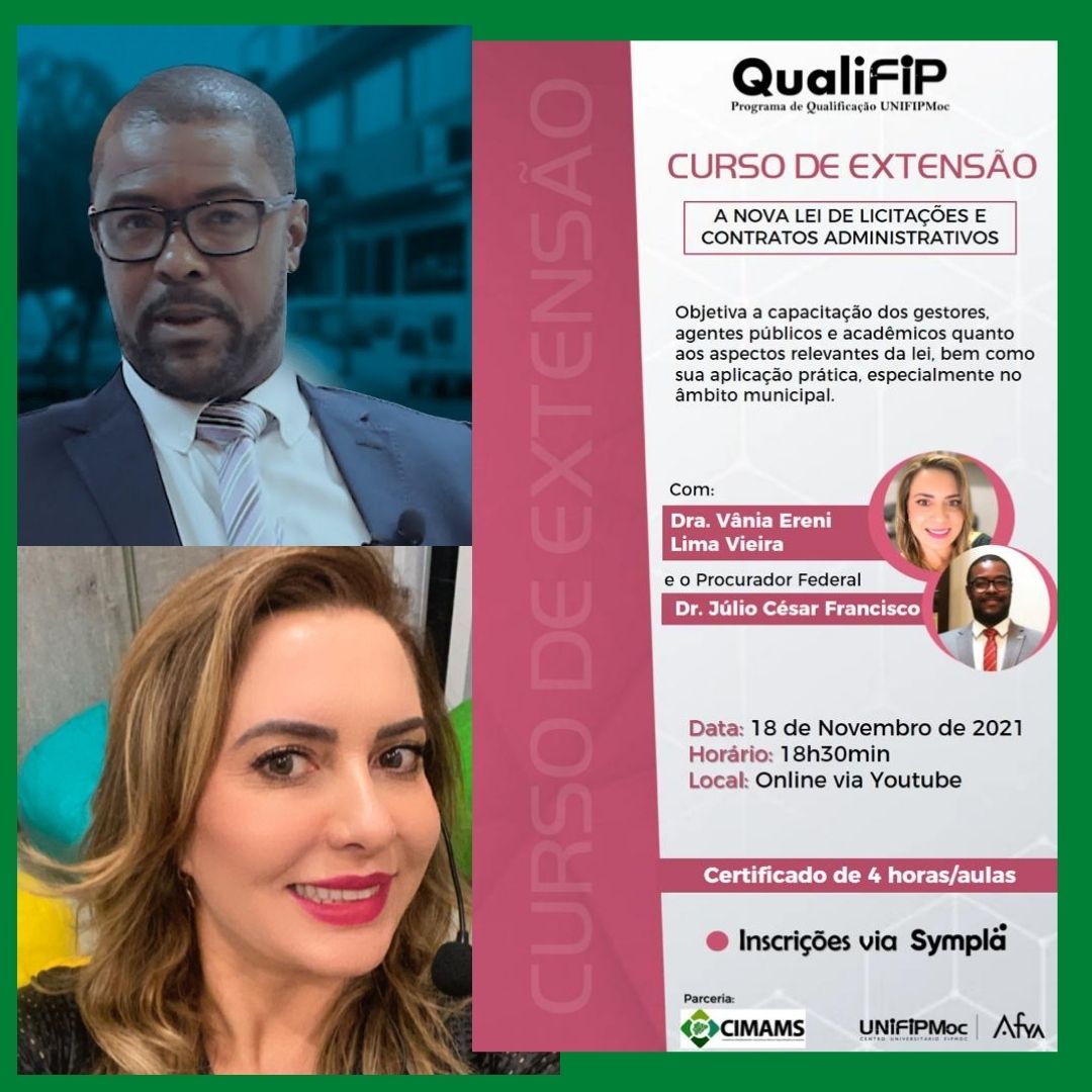 O Consórcio Intermunicipal Multifinalitário da Área Mineira da Sudene – CIMAMS e a UNIFIPMOC realizam nesta quinta-feira, 18/11, às 18h30, através de videoconferência, ”a nova lei de licitações e contratos administrativos”. O curso tem como objetivo capacitar os gestores, agentes públicos e acadêmicos quanto aos aspectos relevantes da lei, bem como sua aplicação prática, especialmente no âmbito municipal.