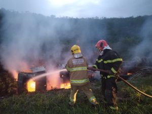 Carreta carregada com tubulação de ferro capota e pega fogo na BR-251