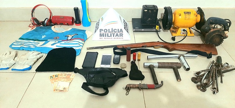 A PM apreendeu com os suspeitos três armas de fogo sendo um cartucheira calibre 12 com munição, uma espingarda do mesmo tipo anterior, calibre 20 e outra espingarda poveira. Os militares também apreenderam no local, um moto-serra, um esmeril, uma makita, duas lanternas, duas caixas de som, um fone de ouvido, três aparelhos celulares, um par de luvas, uma camisa utilizada no crime, um aparelho DVD, uma faca personalizada, materiais para recarga de arma de fogo (espoleta, pólvora e chumbo) e mais a quantia R$140,00 em dinheiro
