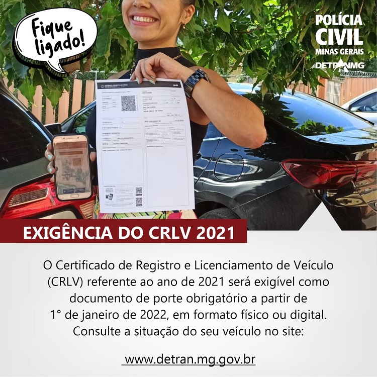 Proprietários de veículos registrados em Minas Gerais devem ficar atentos ao prazo de exigência do Certificado de Registro e Licenciamento de Veículo (CRLV). A partir de 1° de janeiro de 2022, o CRLV referente ao ano de 2021, no formato digital ou impresso, será considerado o documento válido para comprovar a regularidade do veículo em circulação.