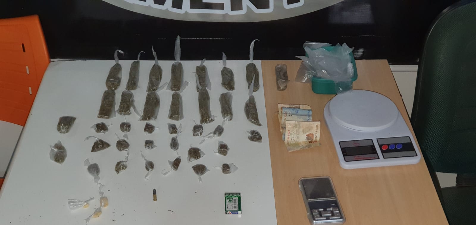 A dupla foi abordada e durante as buscas foram apreendidos tabletes de maconha, 19 porções da mesma droga, três papelotes de cocaína, três pedras da mesma substância, além de duas balanças, um celular e 32 reais em dinheiro.