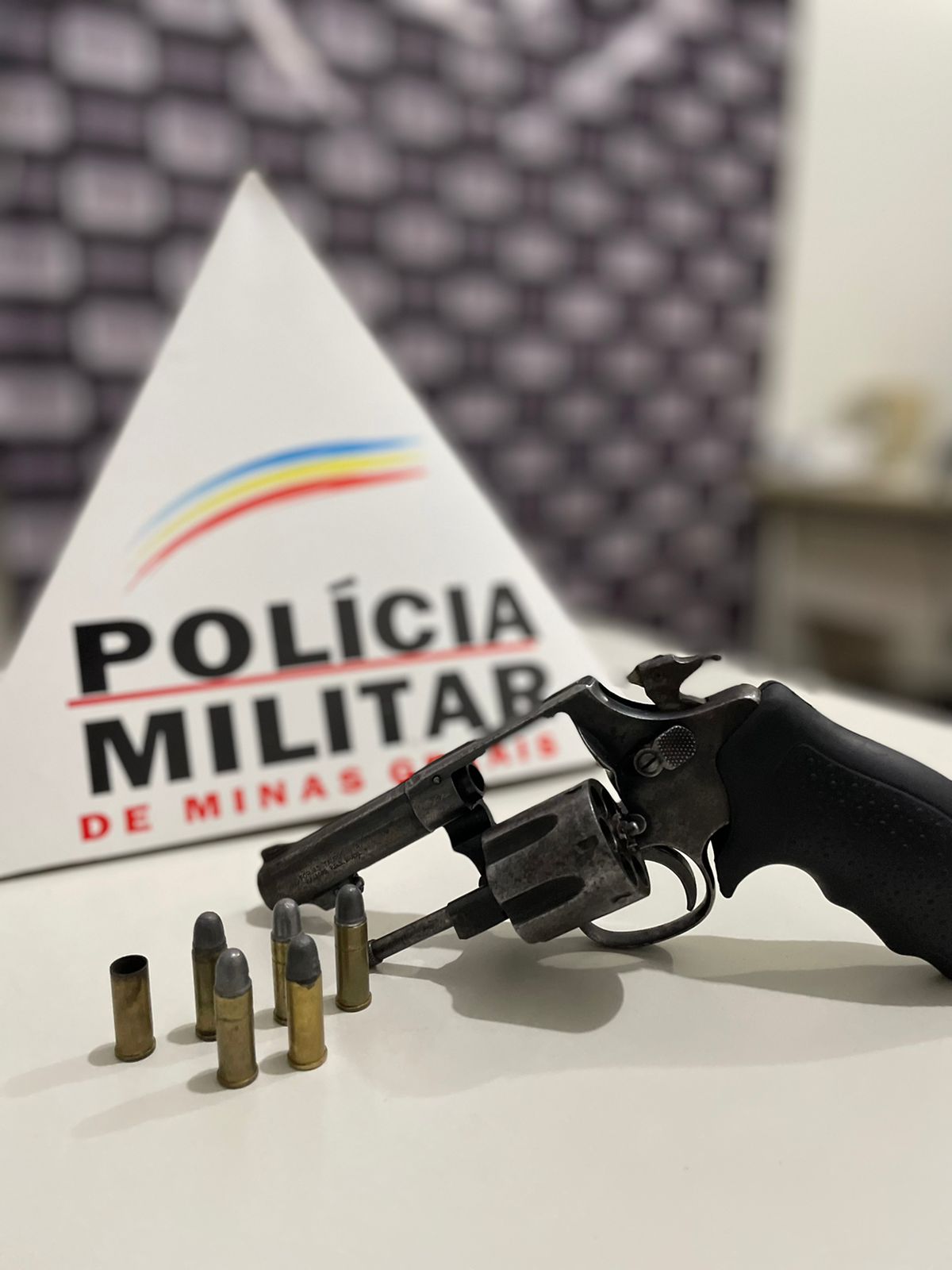 Durante o patrulhamento, os militares viram o suspeito e uma mulher sentada na lanchonete onde a confusão teria começado. Assim que perceberam a presença dos policiais, a mulher entrou rapidamente no local e a suspeita era de que ela estivesse tentando esconder a arma. Foram feitas buscas e o revólver com cinco munições foi encontrado escondido em baixo da pia do banheiro do local.