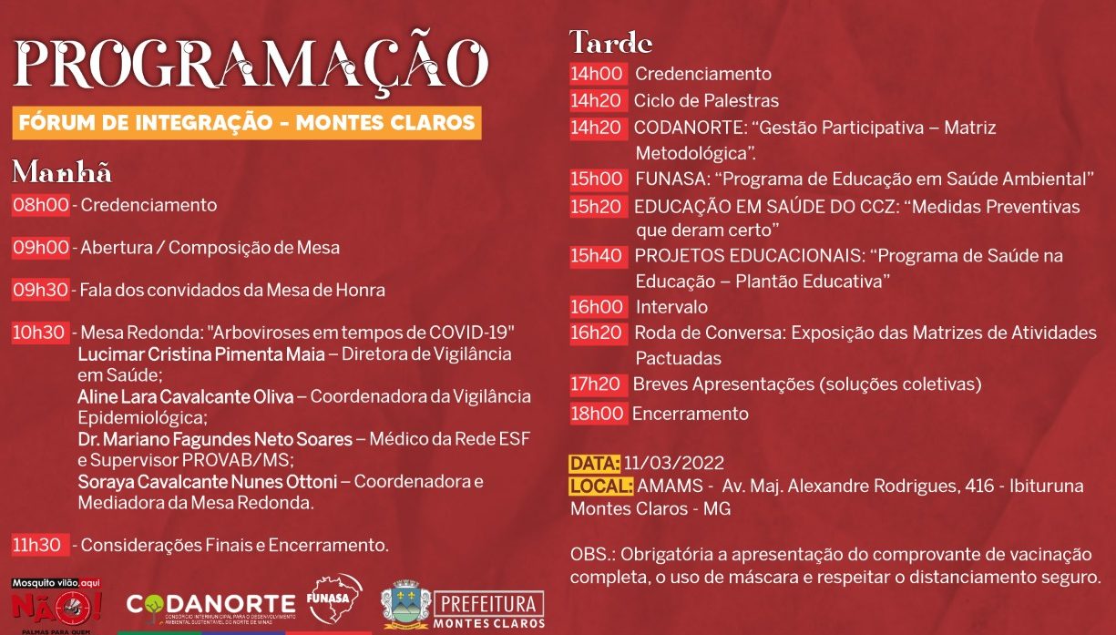 O Fórum será mediado pela coordenadora de projetos do Codanorte, Soraya Otoni. Ela explica que além de Montes Claros, mais 17 cidades serão contempladas com Fóruns, whorkshops, oficinas. “ objetivo das ações é mobilizar e sensibilizar a sociedade e suas representações para a adoção de condutas e práticas para o enfrentamento do vetor Aedes aegypti numa perspectiva da redução de casos de morbimortalidade com impactos na saúde”.