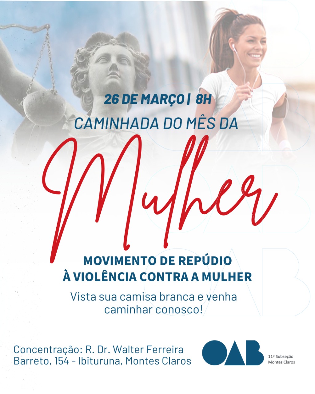 A Caminhada do Mês da Mulher tem como objetivo enfatizar o movimento de repúdio à violência contra as mulheres, por isso, a OAB convoca os participantes a comparecerem vestidos com uma camisa branca. Além disso, antes do início do percurso, uma personal trainer realizará um aquecimento prévio com os participantes. Em Montes Claros, a Caminhada do Mês da Mulher é organizada pela Comissão de Esportes e a OAB Mulher.