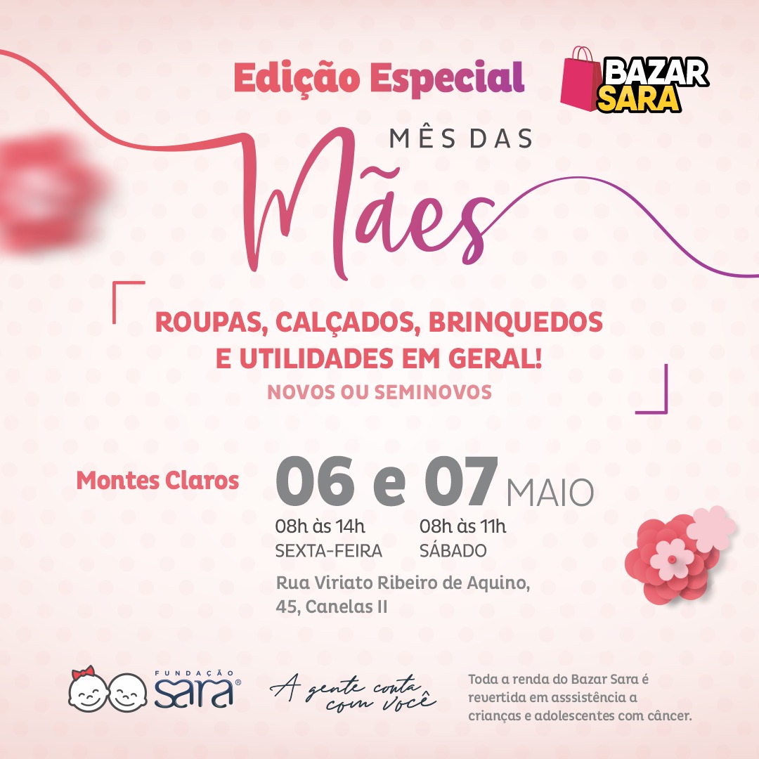 O mês de Maio é dedicado às mães, e, como forma de homenagem a todas elas, a Fundação Sara realiza nesta sexta-feira (06) e sábado (07) um bazar especial que marca o retorno deste importante evento para a instituição. Em razão da aglomeração causada, as edições especiais do Bazar Sara foram suspensas durante a pandemia.