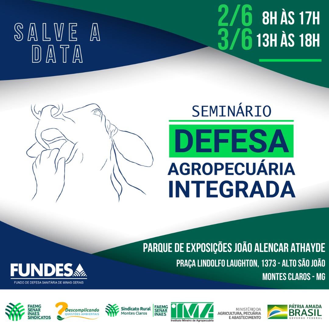 Após passar por Belo Horizonte e Uberaba, o Seminário de Defesa Agropecuária Integrada chega a Montes Claros no dia 2 de junho. Com dez palestras, o evento tem como objetivo somar esforços e debater assuntos relativos aos temas sanitários na produção rural. O evento será no auditório do Parque de Exposições João Alencar Athayde, das 8h às 17h. A programação é uma parceria do Sistema FAEMG e do Instituto Mineiro de Agropecuária (IMA).