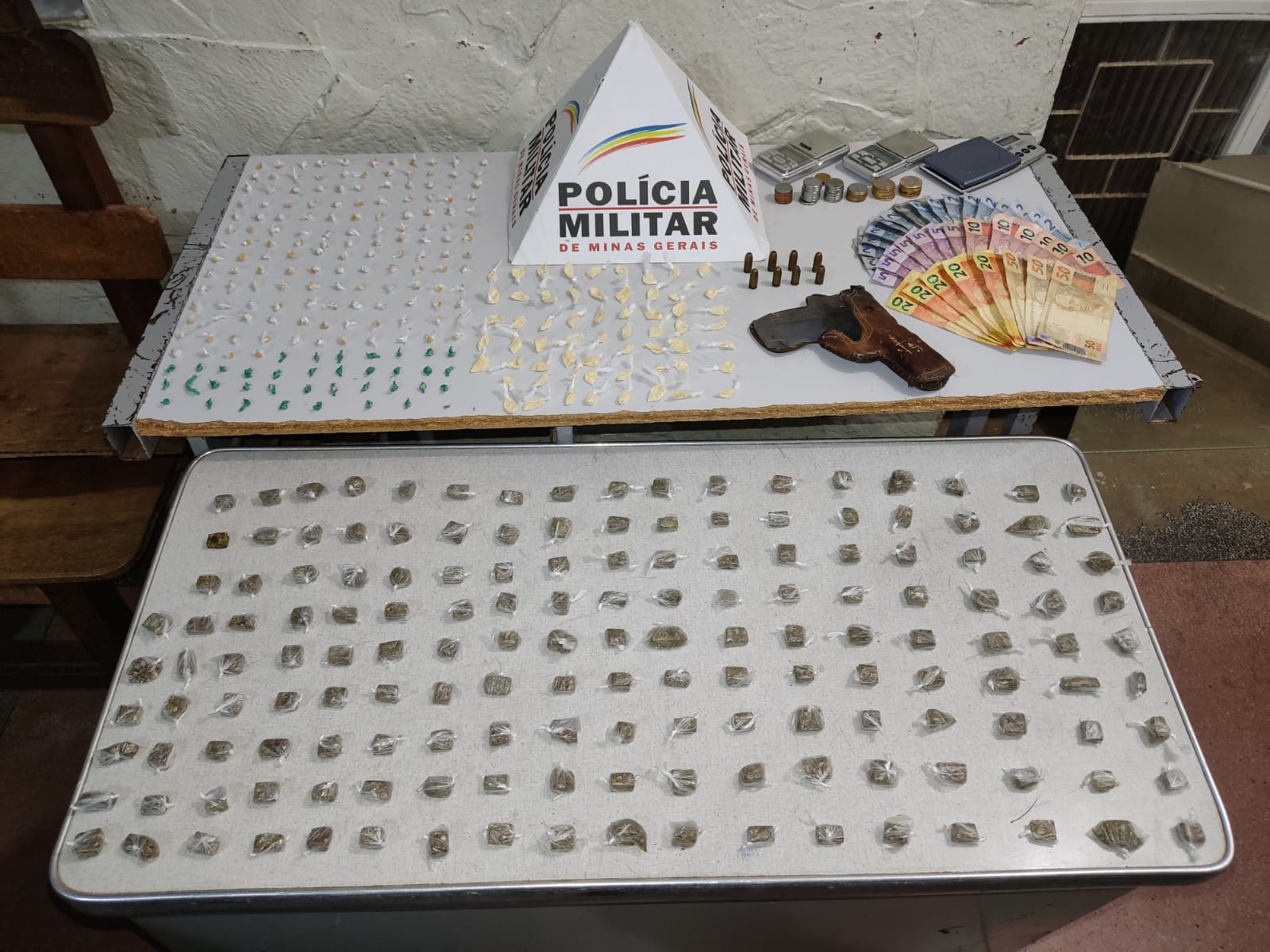 Ao todo foram 183 pedras de crack; 89 buchas de maconha; 20 papelotes de cocaína. No quarto de um terceiro suspeito que não foi encontrado foi localizado ainda um coldre de couro; munição e um tênis, objetos parecidos com os que foram furtados recentemente. Tanto os dois detidos, quanto esse que está foragido possuem passagens. A dupla e a droga foram levados para delegacia.