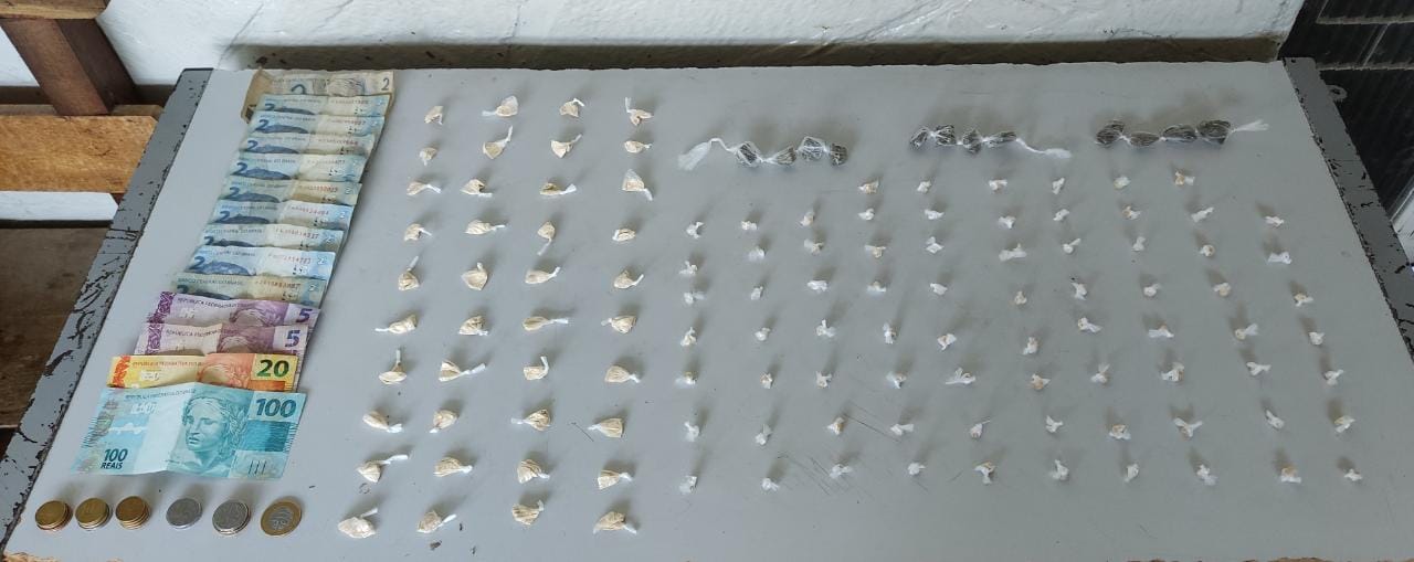 No local haviam várias pessoas e algumas conseguiram fugir, mas o principal alvo foi abordado e durante buscas foram apreendidas 76 pedras de crack, 40 papelotes de cocaína, 12 buchas de maconha e 154 reais em dinheiro. A droga foi apreendida e o traficante foi preso e levado para delegacia.