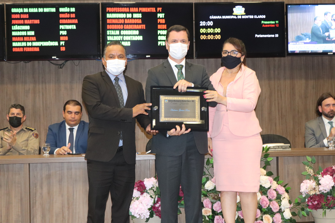 A Câmara Municipal de Montes Claros promoveu na noite desta quinta-feira (30), sessão especial de entrega de Título de Cidadão Honorário ao ministro da Justiça e Segurança Pública, Anderson Gustavo Torres. A homenagem foi de iniciativa da vice-presidente da Casa, vereadora Graça da Casa do Motor (União Brasil), e contou com a participação dos deputados federais Marcelo Freitas (União Brasil) e Igor Timo (Pode), do deputado estadual Carlos Pimenta (PDT) e autoridades de Montes Claros e região.