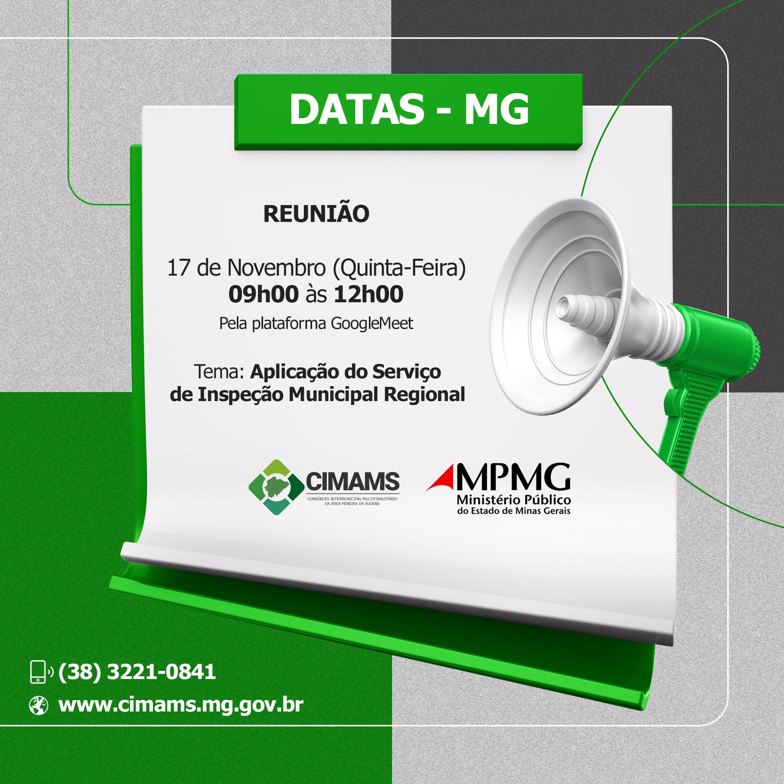 O Consórcio Intermunicipal Multifinalitário da Área Mineira da Sudene – CIMAMS realiza nesta quinta-feira (17), de 9 às 12 horas, o curso sobre a aplicação do Serviço de Inspeção Municipal Regional – SIM, com o município de Datas, pela plataforma GoogleMeet. O objetivo da reunião, que será realizada de forma remota, é alinhar a questão da filiação, o envio do projeto de Lei do SIM, a estimativa de custo, contrato de programa.