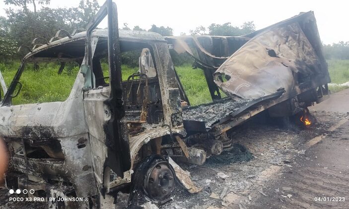 Um caminhão ficou completamente destruído após pegar fogo, na tarde desta quarta-feira (04), na BR-365, próximo a Montes Claros.