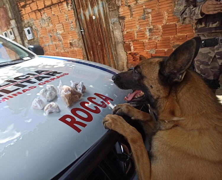 Durante buscas, com o auxílio do cão Drax, da ROCCa, os policiais localizaram 12 pedras grandes brutas de crack e 20 munições calibre 38. em baixo de um colchão.