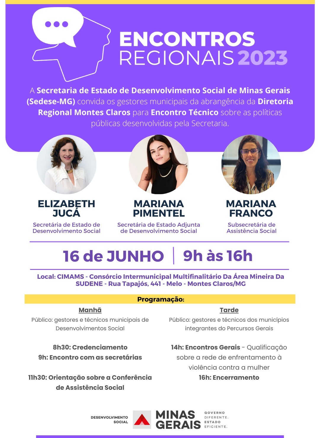 Nesta sexta-feira (16), o CIMAMS realiza Encontro Regional de Gestores (as) com a Secretária de Estado de Desenvolvimento Social de Minas Gerais (Sedese-MG), Elizabeth Jucá, para debate sobre as políticas públicas desenvolvidas pela Secretaria na região norte de Minas Gerais.