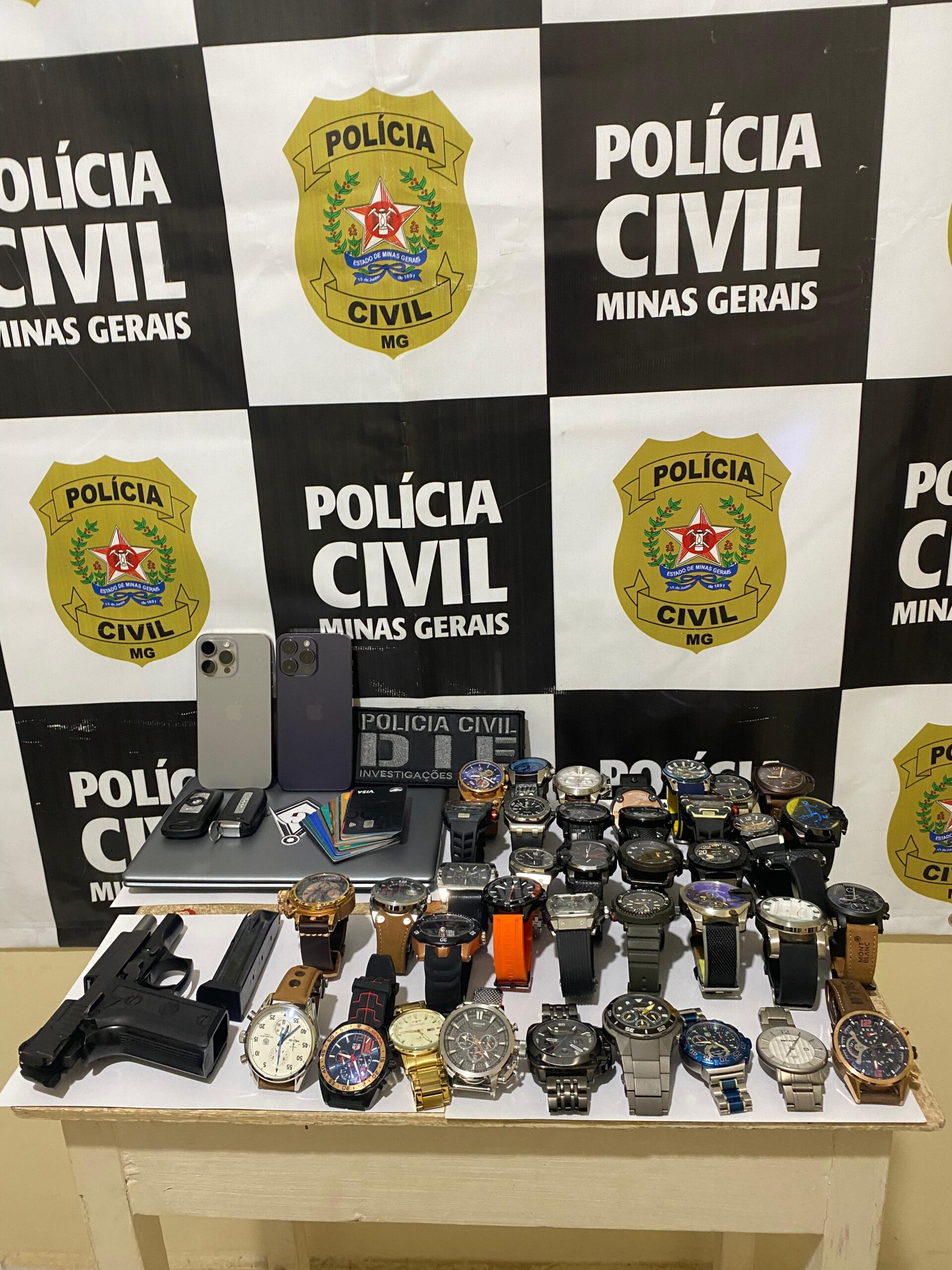 Durante as buscas, foram apreendidos 38 relógios de diversas marcas, 1 notebook, 2 telefones, 20 cartões de débito e crédito em nome dos suspeitos, 4 folhas de cheque no nome do investigado e outra no nome da suspeita. Além disso, dois carros de luxo, um jeep e uma BMW, foram confiscados.