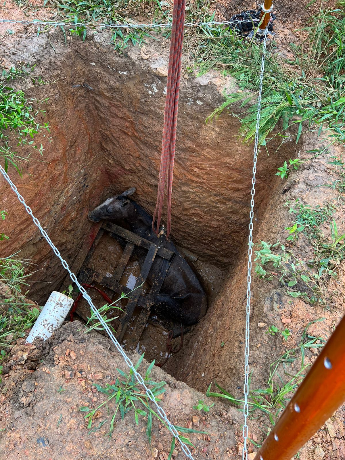 Segundo relatos, os animais estavam pastando livremente pelo bairro quando a tampa improvisada da fossa cedeu sob o peso deles.
