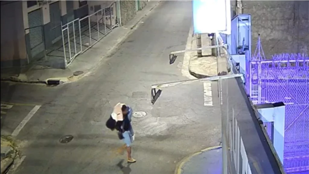 Imagens de um circuito de segurança mostram o momento em que a mulher foi deixada na rua por um motorista de aplicativo desacordada. Em seguida, surge um homem que mexe nas coisas dela, a pega no colo e sai andando.