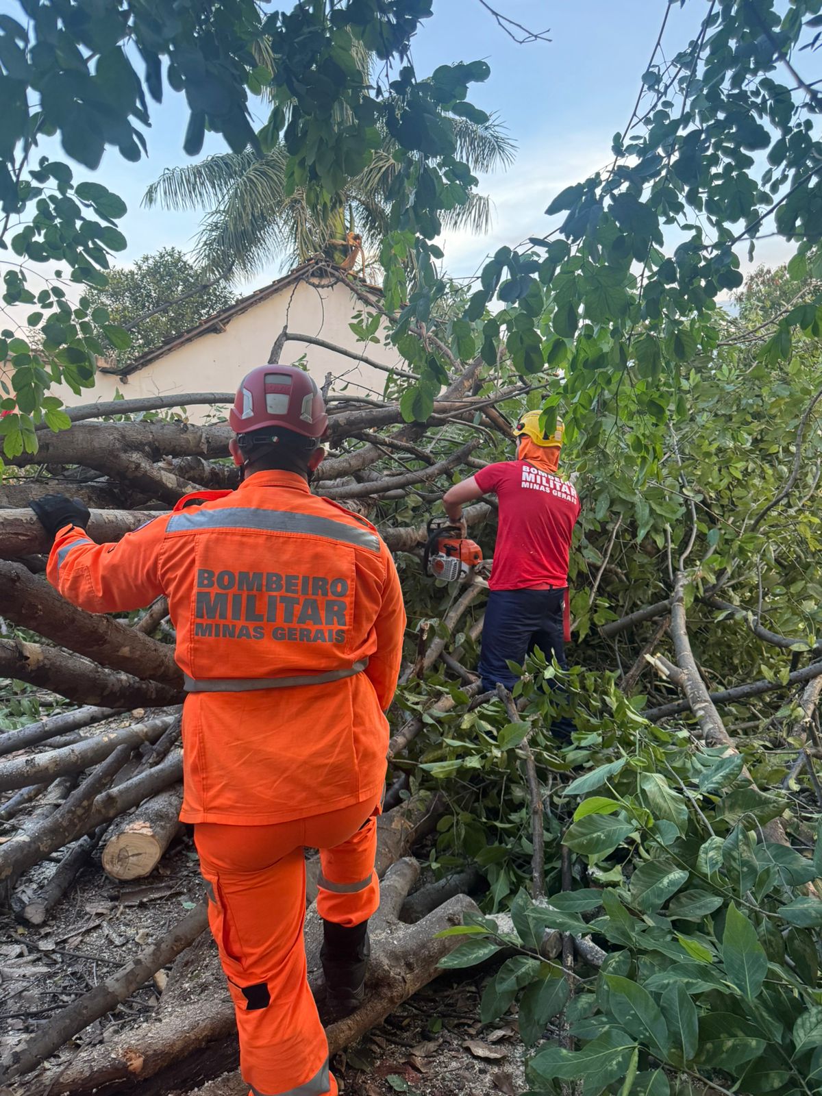 Também no bairro Tancredo Neves, uma árvore da espécie “Gonçalo” com, aproximadamente, oito metros de altura, estava com o tronco escorado sobre a parede de uma residência e a copa posicionada sobre o telhado de amianto. Na oportunidade a guarnição de Bombeiros realizou a supressão total da espécie, sem provocar danos adicionais aos moradores.