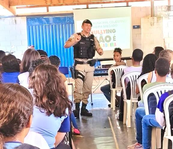 Nesta semana, na Escola Municipal Celestino Pereira Salgado, no bairro Jardim Primavera, os alunos do oitavo e nono anos do Ensino Fundamental participaram de uma palestra sobre bullying, ministrada pelo sargento da Polícia Militar, Maciel. O sargento compartilhou com os jovens suas experiências pessoais, vividas ainda na adolescência, quando enfrentou o bullying, e orientou os alunos sobre os impactos negativos dessa prática na vida das pessoas.