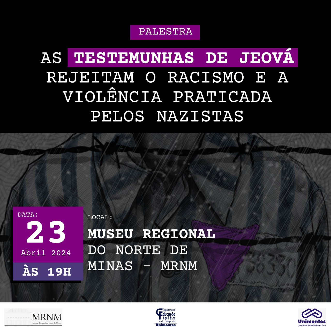 No próximo dia 23 de abril às 19h o Museu Regional do Norte de Minas vai receber a palestra com o tema: “As Testemunhas de Jeová rejeitam o racismo e a violência praticada pelos nazistas”. O objetivo é informar à sociedade moderna como o regime nazista perseguiu, preendeu e executou cerca de 1.500 testemunhas de Jeová durante o período da segunda guerra mundial por sua recusa e objeção em apoiar o governo do Führer.