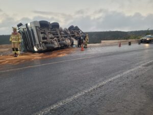 Carreta carregada com livros didáticos tomba no Anel Viário Leste de Montes Claros