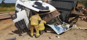 Carreta carregada com livros didáticos tomba no Anel Viário Leste de Montes Claros