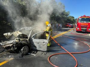 Carro entra em chamas após bater em caminhão e fica totalmente destruído, em Mirabela