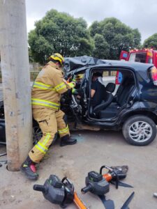 Carro fica destruído após condutor perder o controle e atingir um poste no Centro de Montes Claros