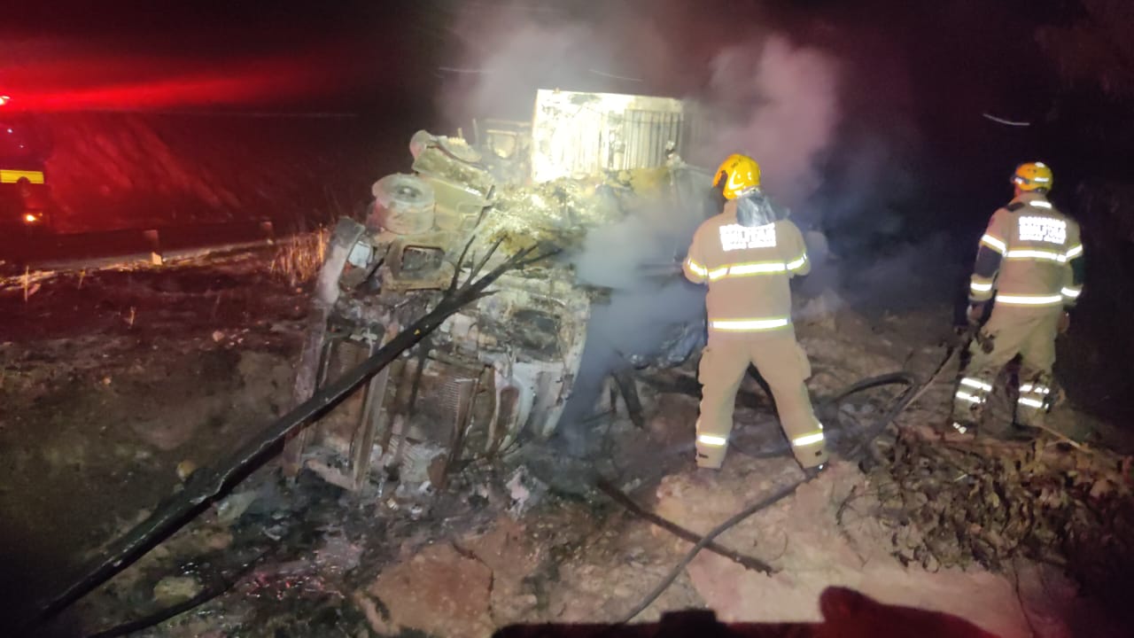 De acordo com a Assessoria de Imprensa do Corpo de Bombeiros, no local, foi verificado que o motorista havia sido socorrido com ferimentos por terceiros, e que o veículo se encontrava em chamas fora da pista de rolamento e que muitos dos animais haviam fugido, dentre outros que morreram. Diante disso, a guarnição sinalizou a via e deu início ao combate às chamas, que atingiram a região da cabine do veículo, como também a vegetação no entorno do acidente.