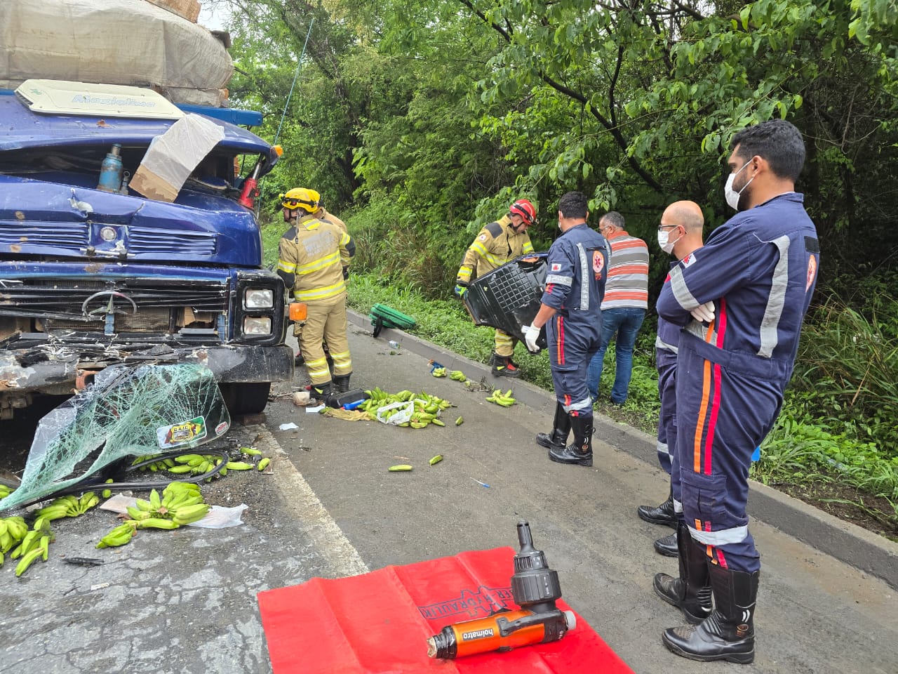 A vítima, identificada como J.C.F., de 51 anos, dirigia um dos caminhões, que transportava uma carga de bananas mal acondicionada. Apesar do impacto, ele estava consciente e orientado quando a equipe de resgate chegou ao local. Os bombeiros, utilizando técnicas avançadas de salvamento terrestre, realizaram o desencarceramento da vítima, que foi entregue aos cuidados da equipe do SAMU. Após os primeiros atendimentos, J.C.F. foi encaminhado ao Hospital Santa Casa, onde deve receber o tratamento necessário para sua recuperação.