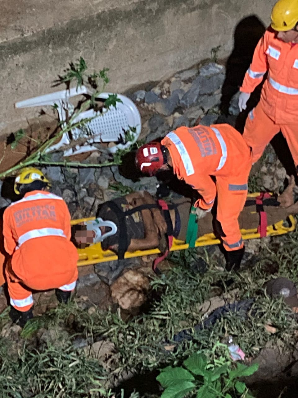 O acidente ocorreu em um trecho de declive acentuado, com altura estimada em 10 metros. O homem, de 28 anos, apresentava confusão mental, ferimentos no rosto e nos braços. O resgate foi realizado com o auxílio de duas equipes de bombeiros, utilizando equipamentos especializados, como uma prancha rígida, uma maca tipo envelope e um sistema de redução de forças para garantir a segurança durante a retirada do córrego.