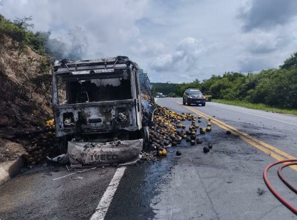 Um caminhão carregado de melões ficou totalmente destruído após pegar fogo na BR-251, em Salinas, na manhã desta terça-feira (7). Felizmente, o motorista saiu ileso do incidente.