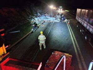 Carreta carregada com livros didáticos tomba no Anel Viário Leste de Montes Claros