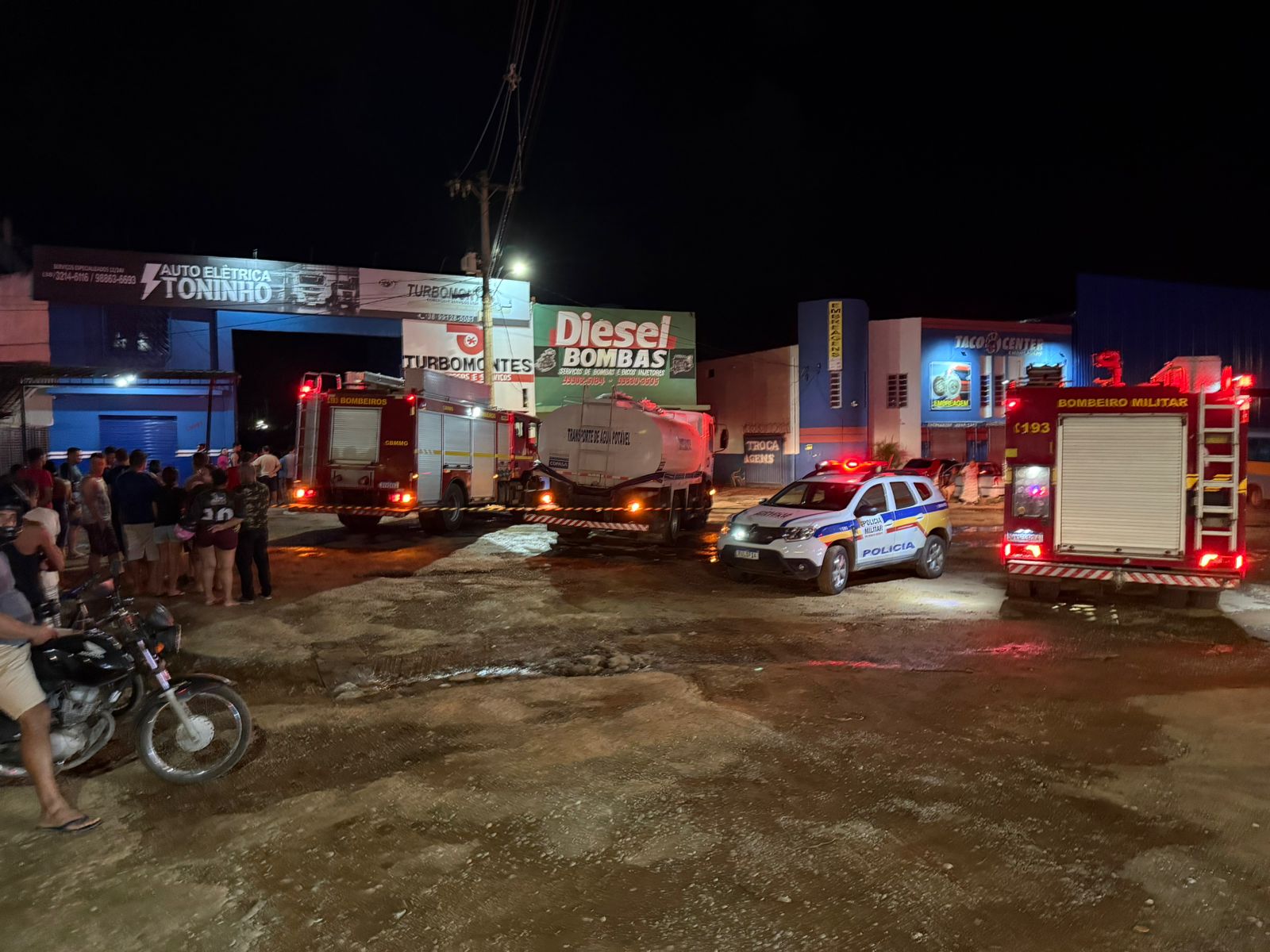 A equipe inicial de Bombeiros chegou ao local a bordo de uma auto-bomba e encontrou o fogo já em estágio avançado. A oficina, que prestava serviços de manutenção automotiva, borracharia e autoelétrica, apresentava chamas altas em seu interior. Os proprietários do estabelecimento já estavam no local, facilitando o acesso das equipes de emergência.