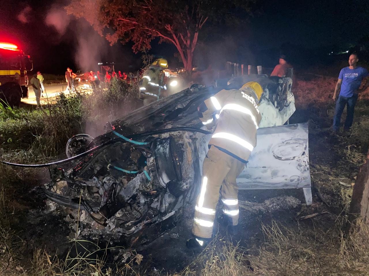 O Corpo de Bombeiros foi acionado e, ao chegar ao local, realizou o combate às chamas, extinguindo completamente o incêndio. Com a remoção do fogo, foi possível identificar duas vítimas fatais dentro do carro.