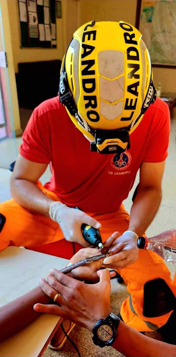 Ao chegar ao quartel, os militares realizaram uma inspeção visual no dedo comprometido. Com o uso de equipamentos de proteção individual (EPIs) e mantendo o membro elevado para ajudar na redução do edema, os bombeiros utilizaram uma micro retífica para cortar cuidadosamente o anel e removê-lo com total segurança, priorizando a integridade física do adolescente.