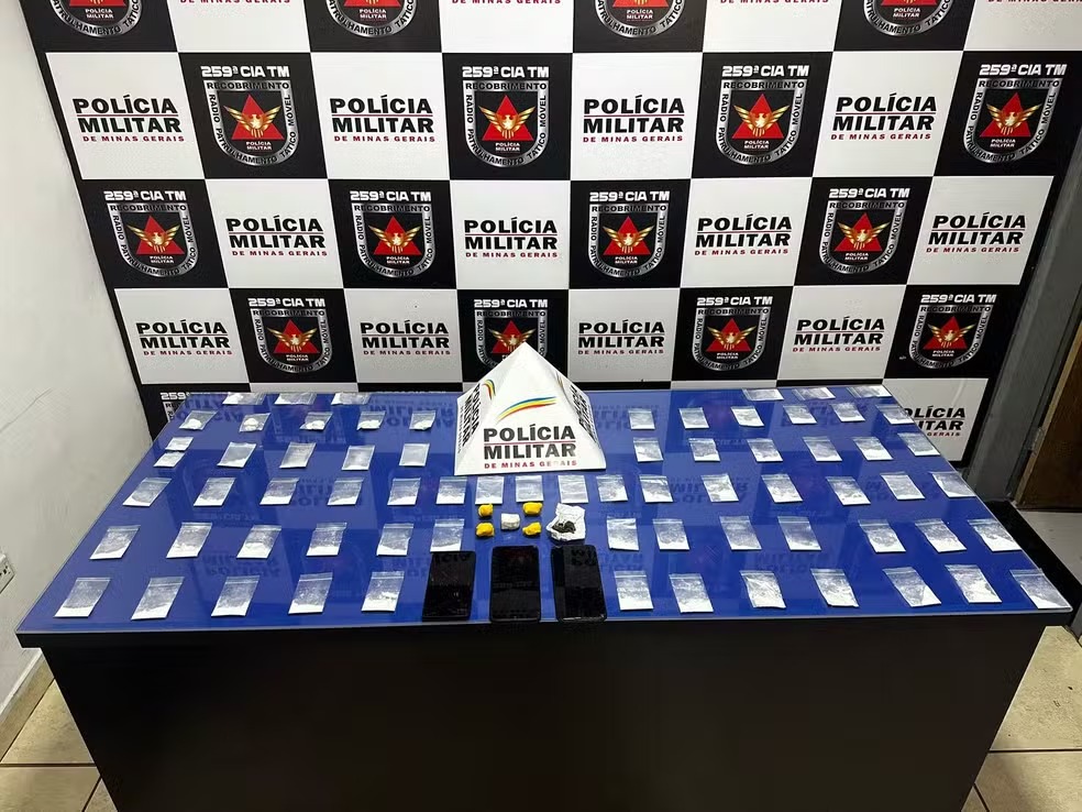Dentro do imóvel, os militares encontraram dois homens, de 19 e 30 anos. No quintal, um casal foi abordado — a mulher chegou a arremessar o celular no chão ao perceber a ação policial. Já na sala da casa, foi localizada uma sacola contendo 11 pedras grandes e 62 porções de cocaína.