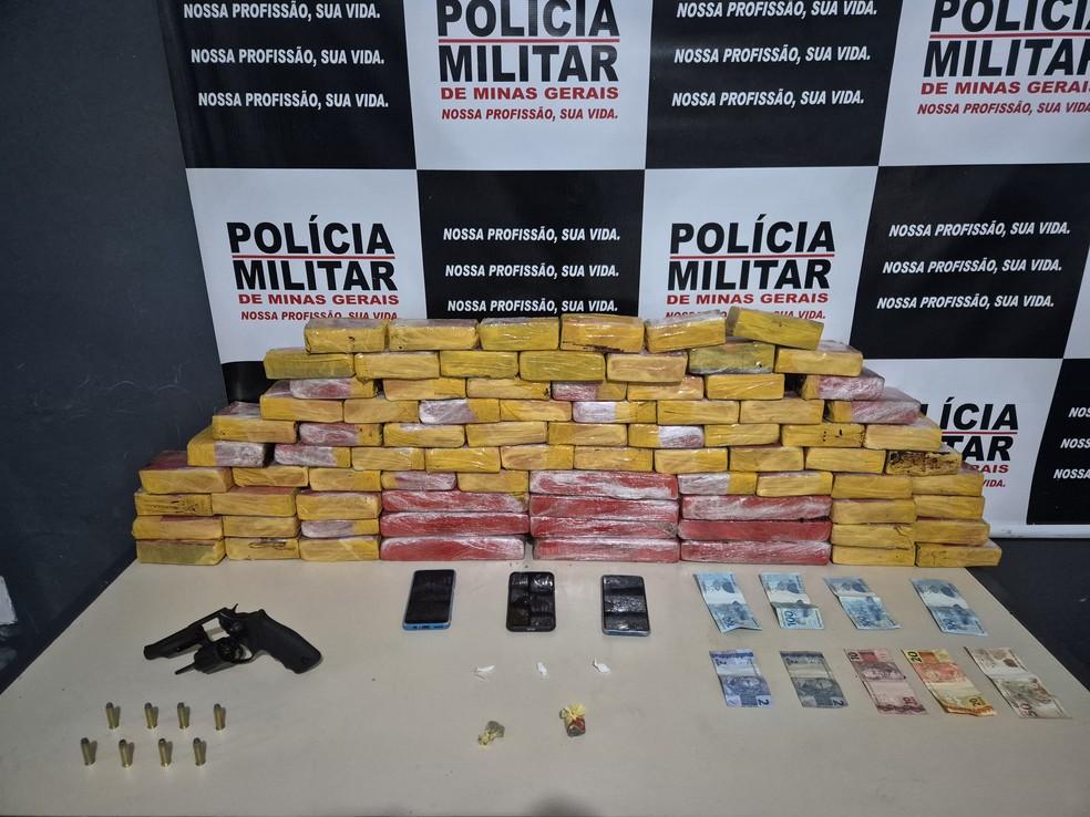Além das 86 barras de maconha, foram apreendidos dois tabletes adicionais da mesma substância, três papelotes de cocaína, o revólver, munições, três celulares e R$ 120 em dinheiro.