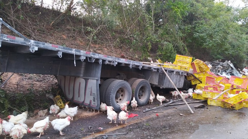 De acordo com a Polícia Rodoviária Federal (PRF), o motorista relatou que o sistema de freios apresentou falha, fazendo com que ele perdesse o controle da direção e colidisse lateralmente com uma carreta que seguia no sentido oposto. Com o impacto, a carga de aves se espalhou pela pista.