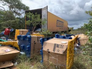 Carreta carregada com livros didáticos tomba no Anel Viário Leste de Montes Claros