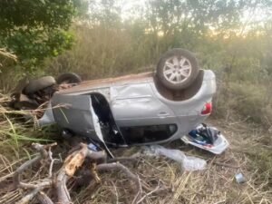 Motorista cochila ao volante e carro capota na MG-181, deixando três feridos em Bonfinópolis de Minas