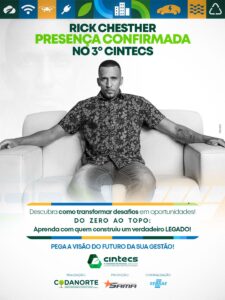 No 3º CINTECS, Rick Chesther será o destaque com a palestra “PEGA A VISÃO”, que promete sacudir o público com uma mensagem potente e transformadora. Com sua linguagem simples, direta e cheia de energia, Rick vai provocar uma verdadeira reflexão sobre o papel do empreendedorismo na vida das pessoas e na gestão pública.