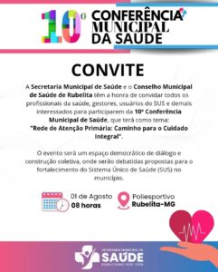 A Prefeitura de Rubelita, por meio da Secretaria Municipal de Saúde e do Conselho Municipal de Saúde, realiza no dia 1º de agosto a 10ª Conferência Municipal de Saúde, com o tema “Rede de Atenção Primária: Caminho para o Cuidado Integral”. O evento acontecerá a partir das 8h, no Poliesportivo de Rubelita-MG.